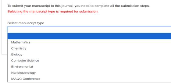 سابعا: نقرة على Selection manuscript type  اختر  الاختيار الأخير من القائمة المنسدلة  IAAQC Conference